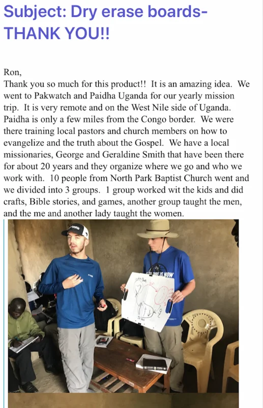 I met Ron at a business expo and immediately thought the portable dry erase boards was a very clever idea. Each year our church, North Park Baptist, goes on yearly international mission trips and often times we are in pretty remote locations. Chalkboards and dry erase boards are hardly ever present to facilitate the teaching that we are doing. This year we went to the West Nile part of Uganda and served with our local missionary to help plant churches, train the pastors, train the women, and did vacation Bible school for thousands of children. Our focus is train the people of Uganda on how to evangelize and the true meaning of the Gospel of Jesus Christ. Below are pictures of our trip.